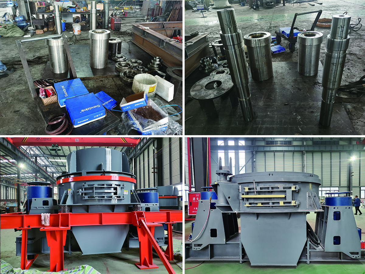 立軸式?jīng)_擊破碎機(jī)在使用時(shí)物料通過(guò)一個(gè)有物料村里的料斗給入破碎機(jī),料斗底部有液壓閘門控制給入轉(zhuǎn)子的物料量,物料在自身重力作用下給入進(jìn)料管,然后沿進(jìn)料管給到轉(zhuǎn)子,由電機(jī)驅(qū)動(dòng)皮帶輪帶動(dòng)轉(zhuǎn)子高速旋轉(zhuǎn)。物料進(jìn)入轉(zhuǎn)子后,在高速旋轉(zhuǎn)的離心力的作用下被加速到45-72米/秒。然后物料沿著轉(zhuǎn)子的導(dǎo)流板高速拋射。從轉(zhuǎn)子發(fā)射出的高速物料與破碎腔內(nèi)堆積的物料或者護(hù)板發(fā)生激烈的撞擊,通過(guò)石頭的高速碰撞產(chǎn)生沖擊、劈裂和研磨作用,從而達(dá)到破碎的目的。